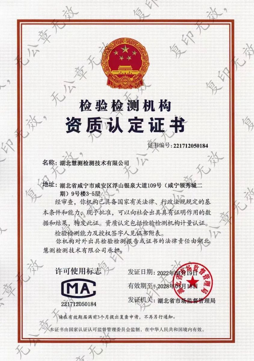 春和景明,萬物勃生。日前,湖北慧測檢測技術有限公司(以下簡稱“慧測檢測”)喬遷新辦公樓并復查換證成功取得CMA資質證書。雙喜臨門,這個四月,或將成為慧測檢測發展史上的又一里程碑。