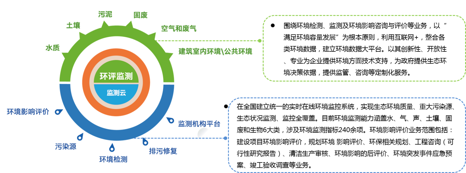 圍繞環(huán)境檢測、監(jiān)測及環(huán)境影響咨詢與評價(jià)等業(yè)務(wù),以“滿足環(huán)境容量發(fā)展”為根本原則,利用互聯(lián)網(wǎng)+,整合各類環(huán)境數(shù)據(jù),建立環(huán)境數(shù)據(jù)大平臺。以其創(chuàng)新性、開放性、專業(yè)為企業(yè)提供環(huán)境方面技術(shù)支持,為政府提供生態(tài)環(huán)境決策依據(jù),提供監(jiān)管、咨詢等定制化服務(wù)。